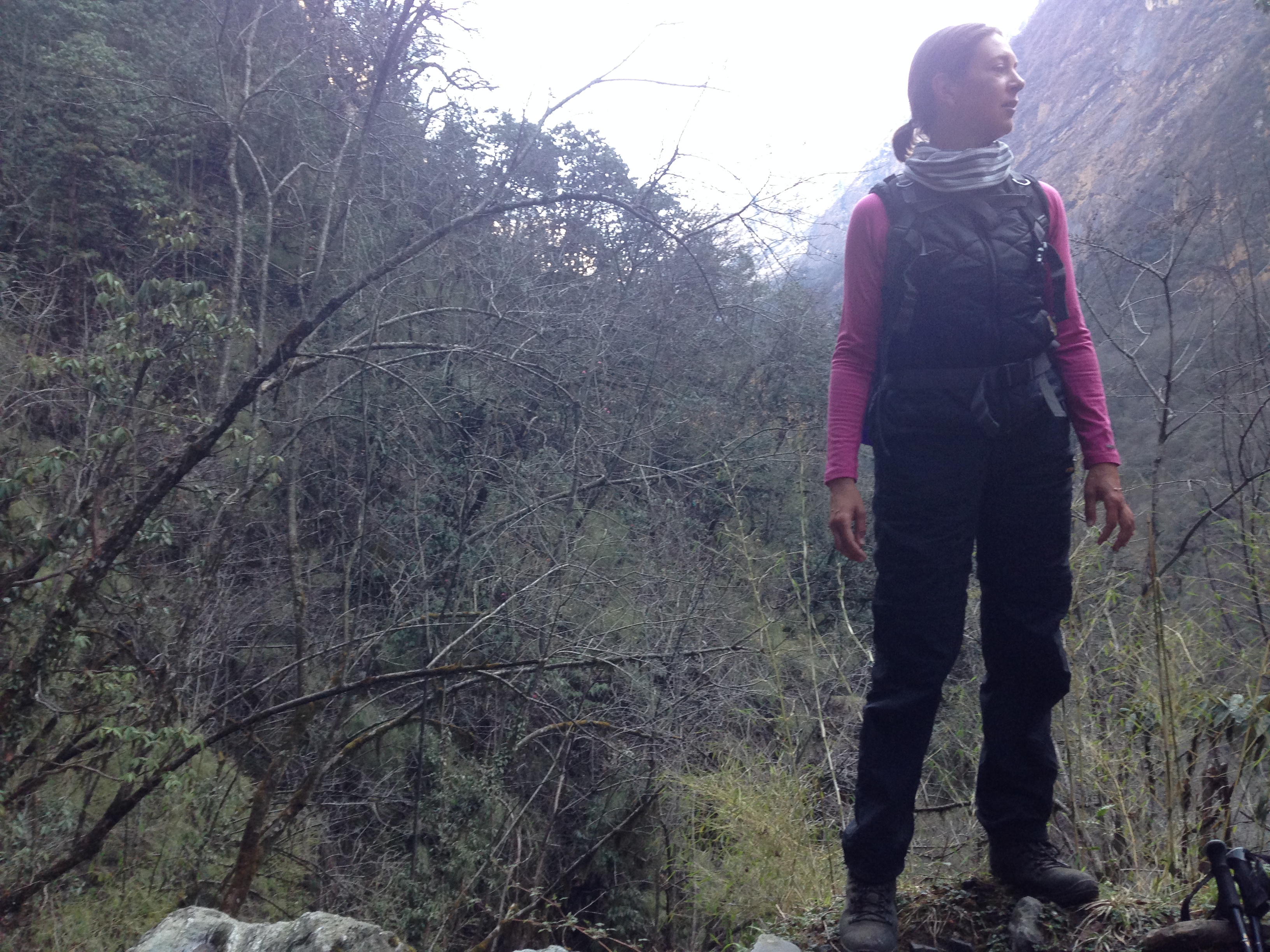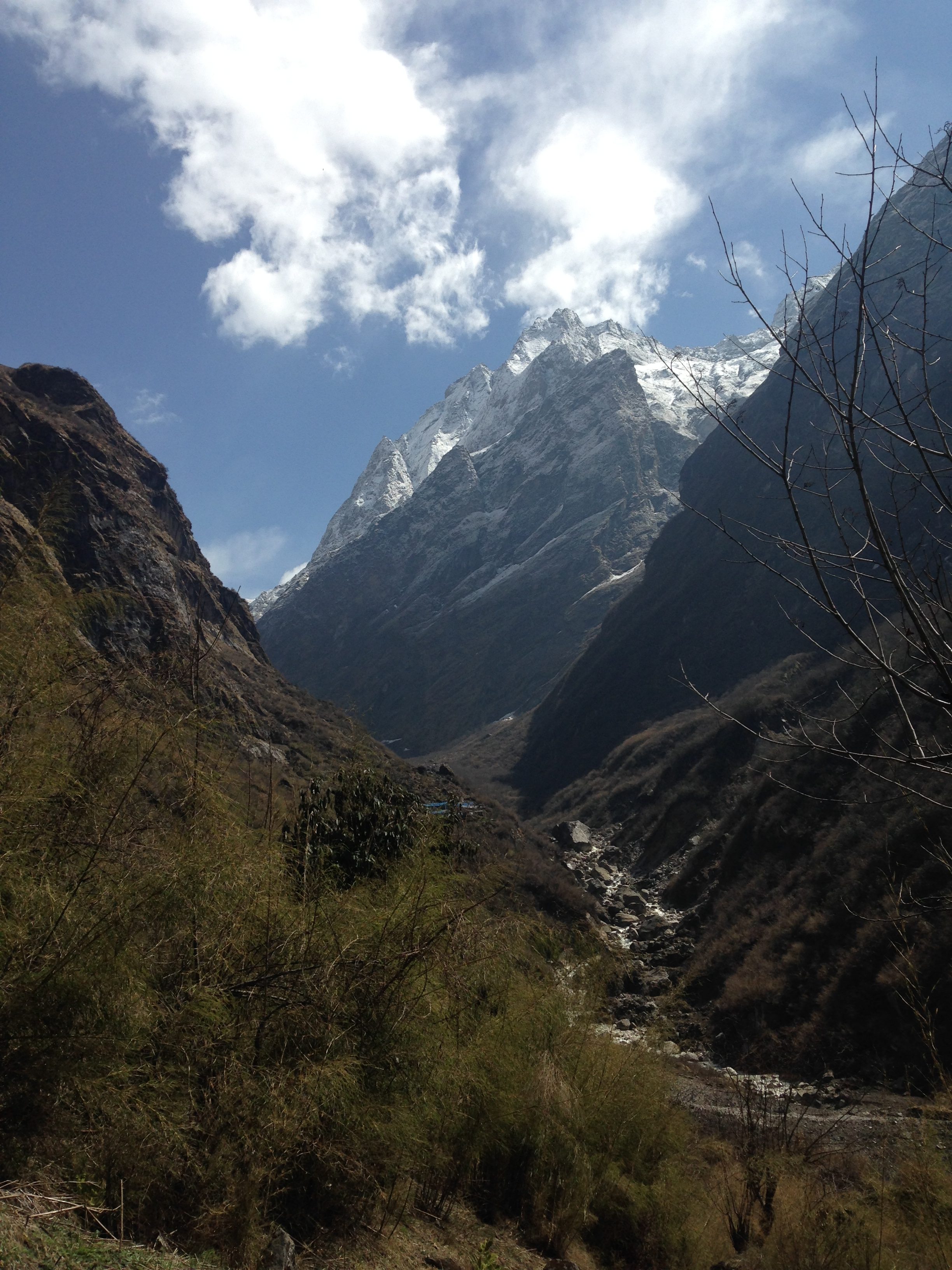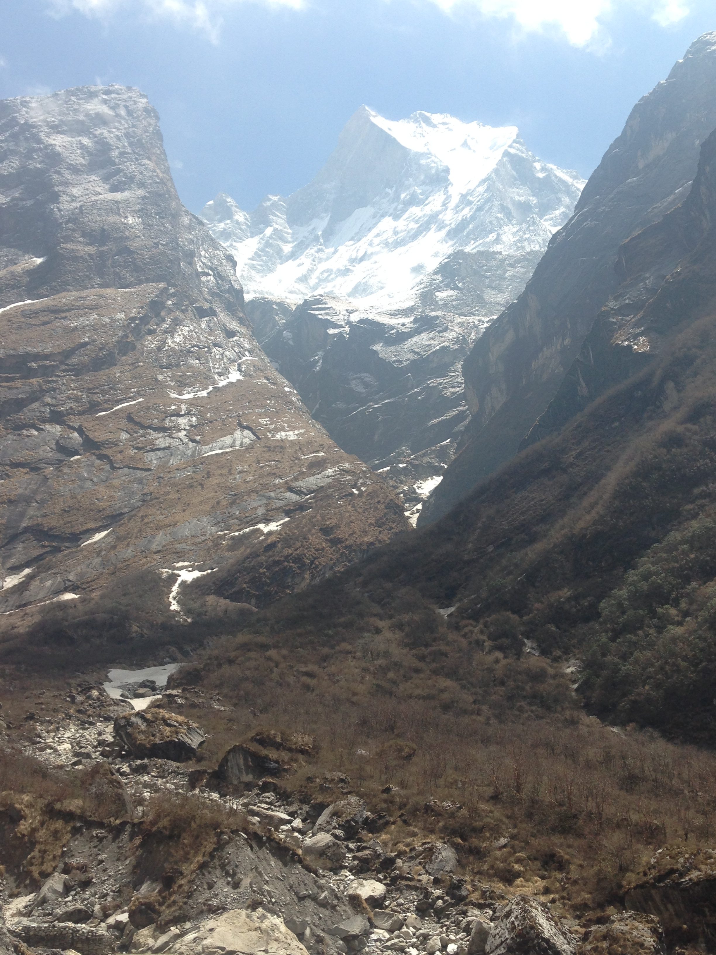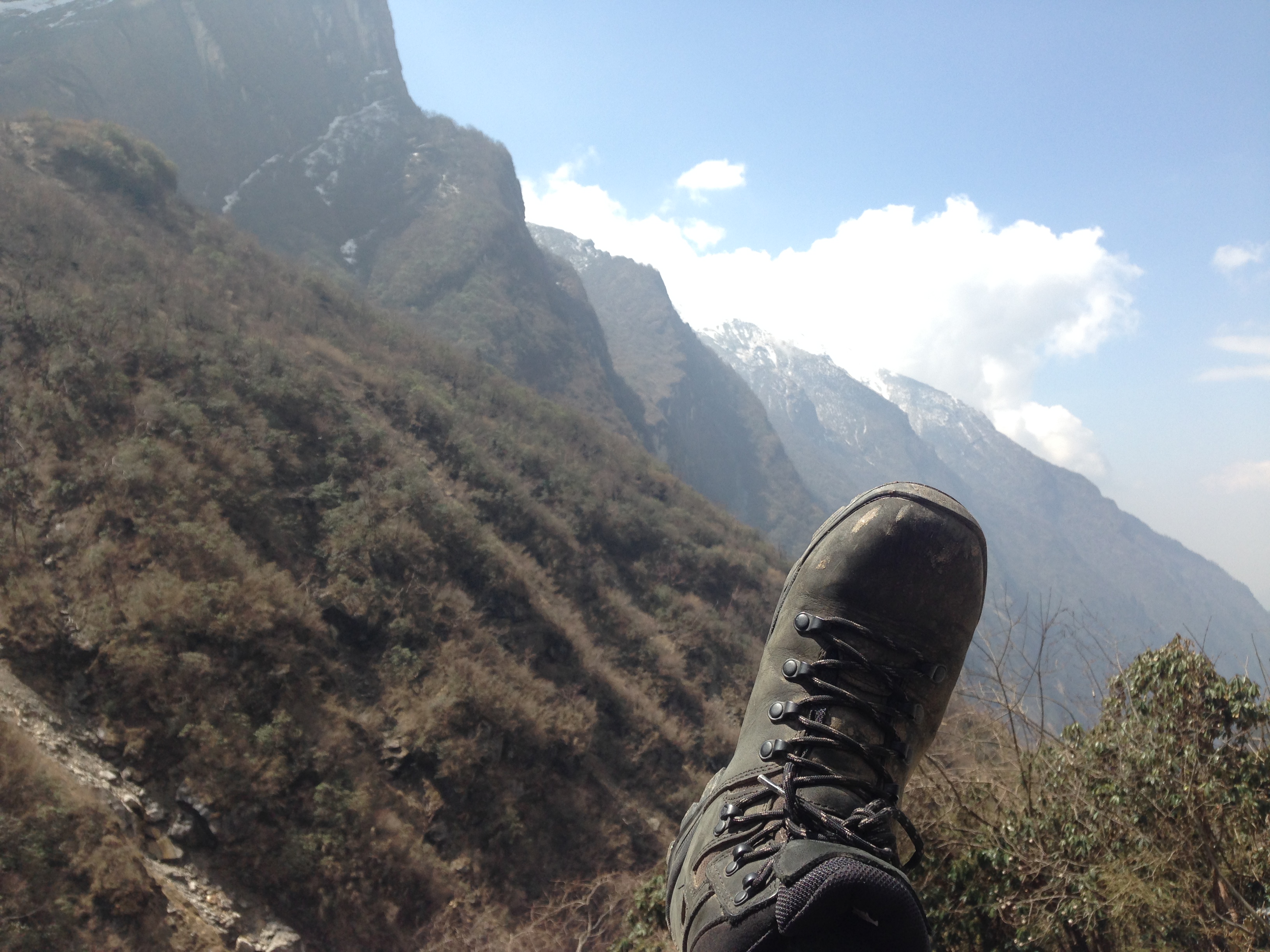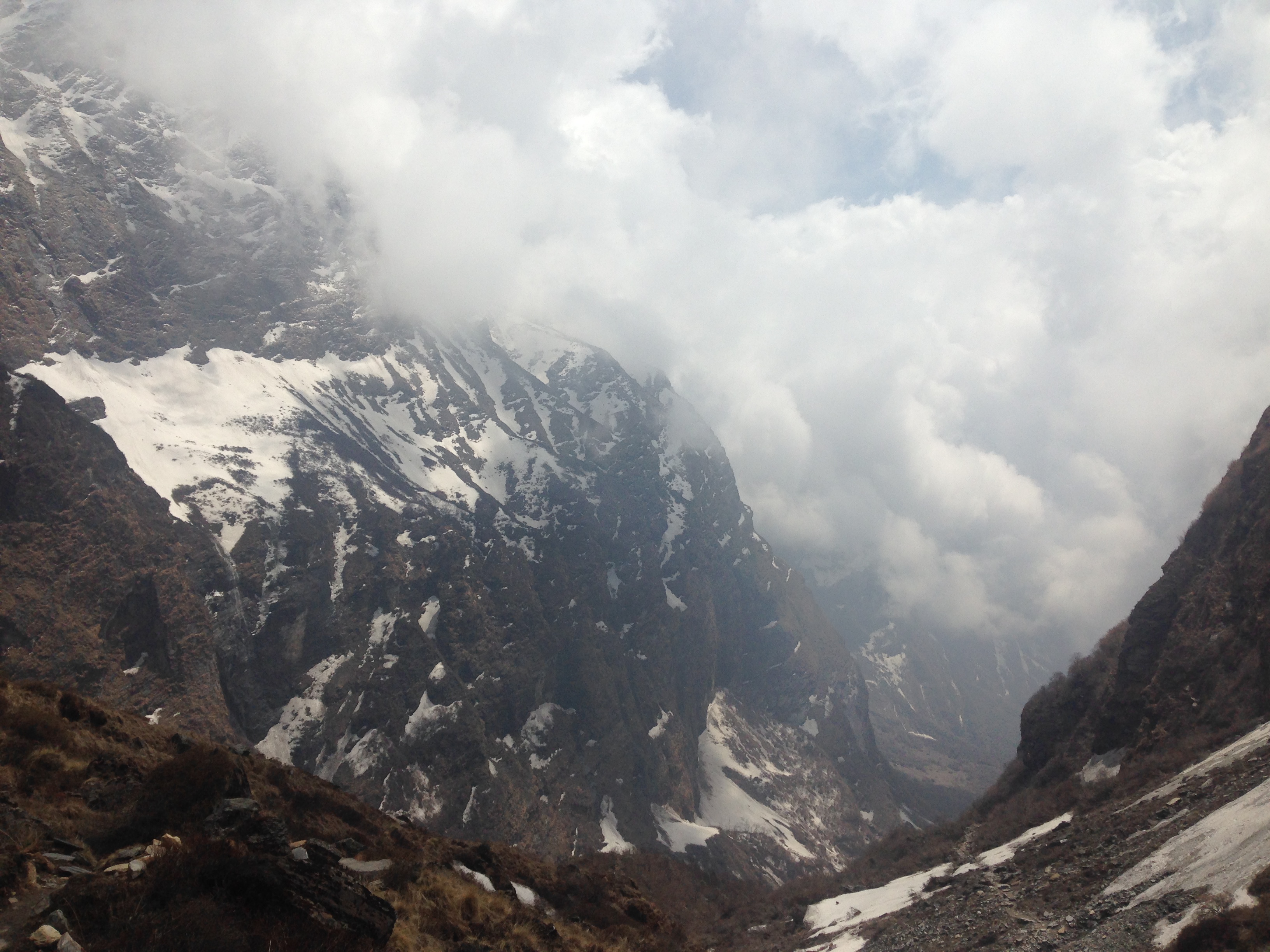 This was probably one of the toughest mentally challenging days on the trek. Due to the weather forecast our guide Hebi checked with us and asked if we would be willing and happy to trek all the way up to Base Camp that day. Stephen and me were all game and decided to give it a bash, (thank goodness for our well prepared and quick thinking guide, because two days later the weather had deteriorated quite a lot more and those who made it to ABC didn’t have any of the views of the surrounding mountains). So we left early in the morning and on our way up we made it through quite a bit of different terrain, moving from the bamboo forests, through valleys and passes, up the rocky areas until we made it to the snowy bits. Again this was one of the longest days walking and starting out what would have been fine to do in shorts and a T-shirt, was definitely layered up with snow gear by the end of the day.