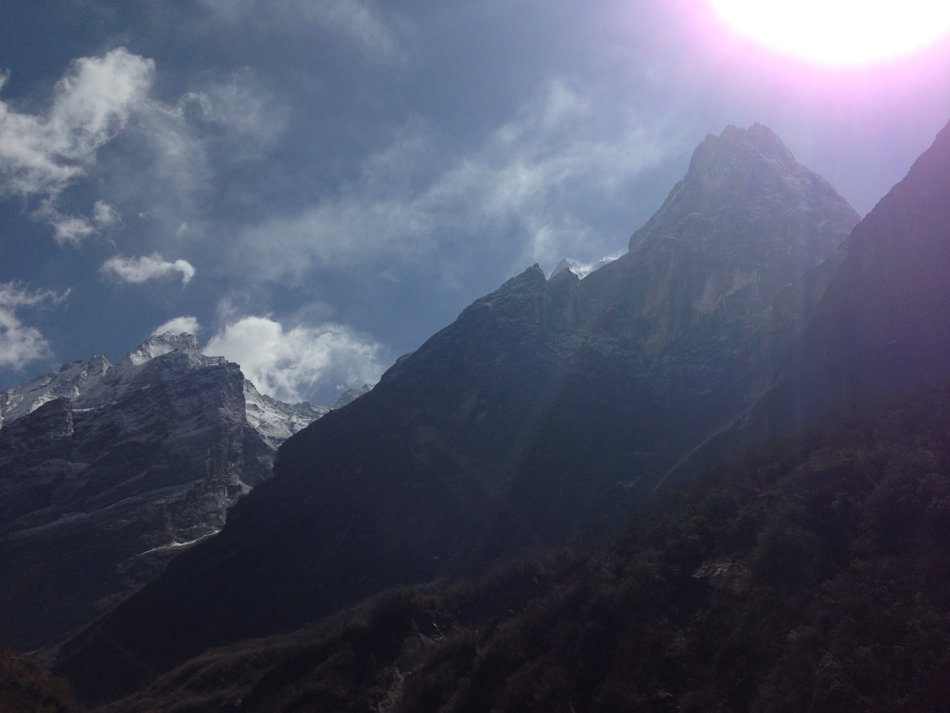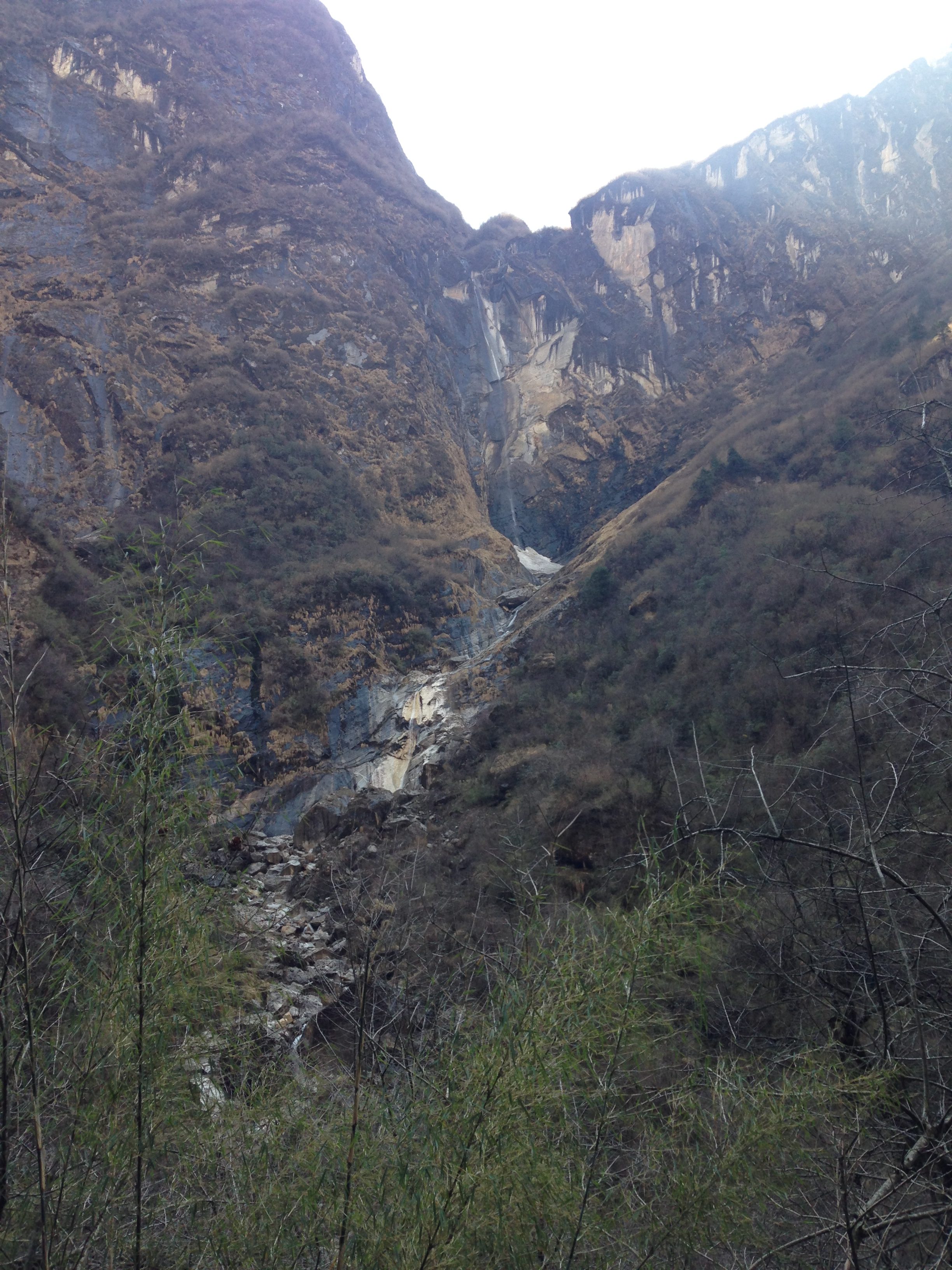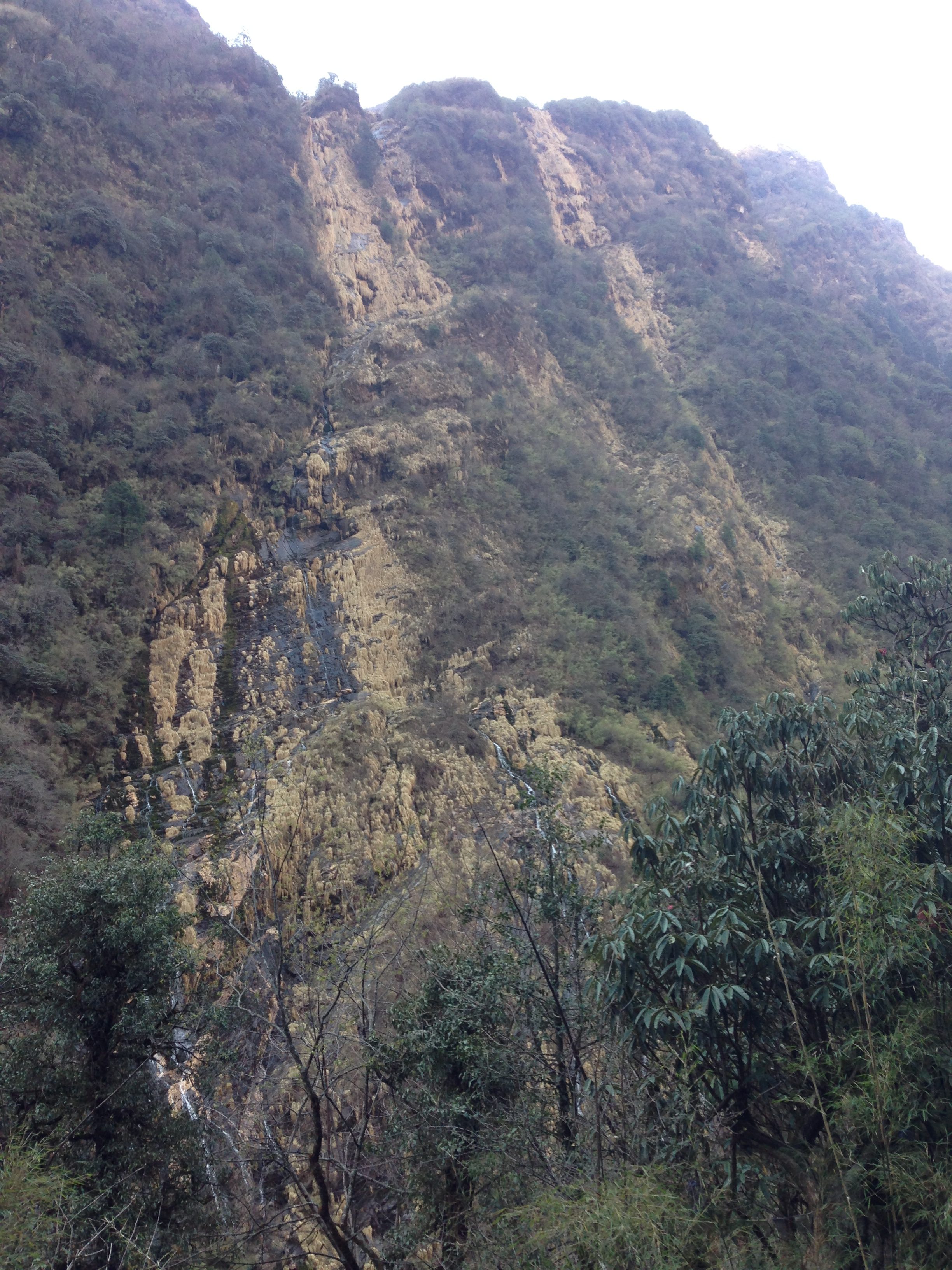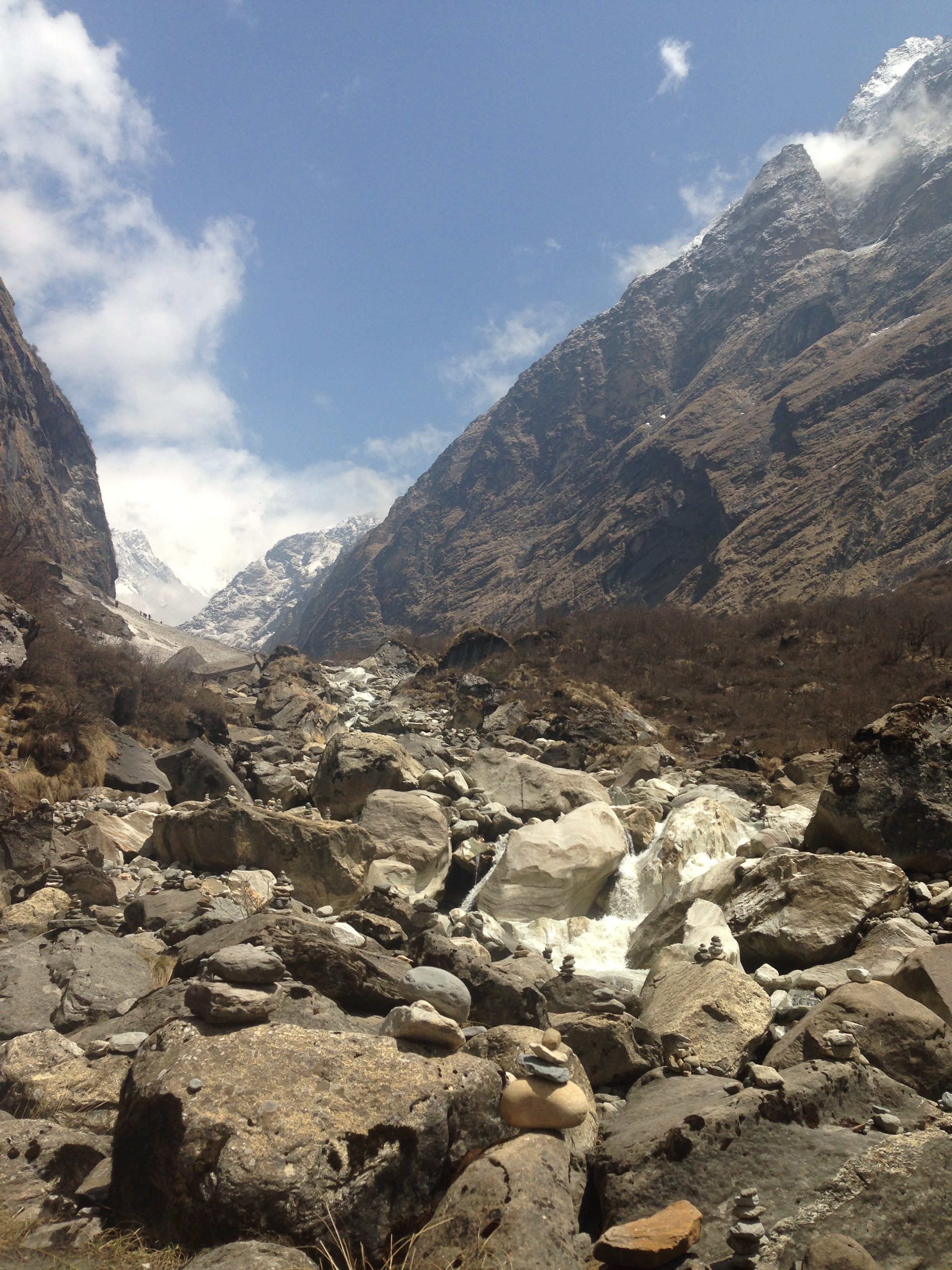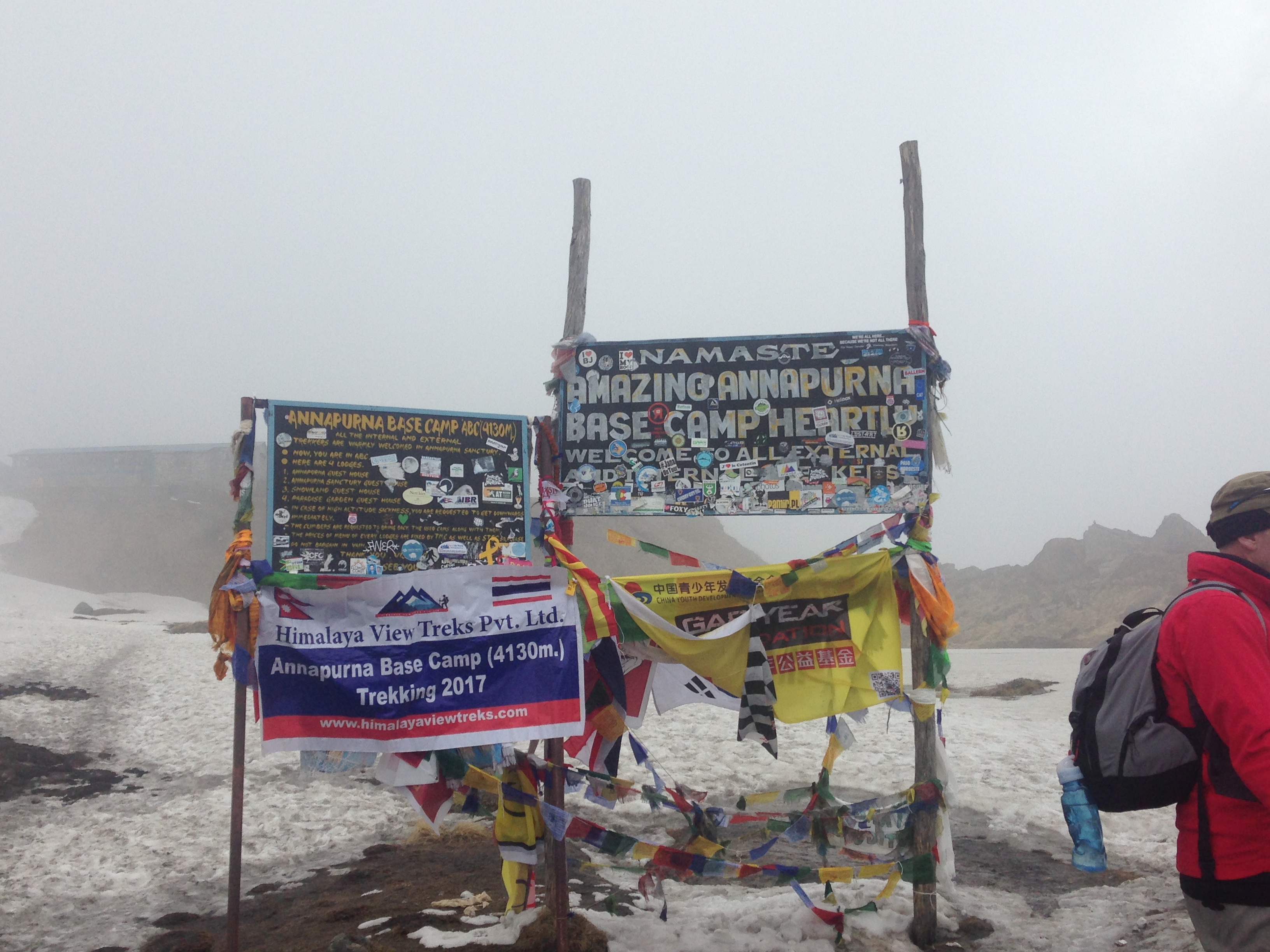 This was probably one of the toughest mentally challenging days on the trek. Due to the weather forecast our guide Hebi checked with us and asked if we would be willing and happy to trek all the way up to Base Camp that day. Stephen and me were all game and decided to give it a bash, (thank goodness for our well prepared and quick thinking guide, because two days later the weather had deteriorated quite a lot more and those who made it to ABC didn’t have any of the views of the surrounding mountains). So we left early in the morning and on our way up we made it through quite a bit of different terrain, moving from the bamboo forests, through valleys and passes, up the rocky areas until we made it to the snowy bits. Again this was one of the longest days walking and starting out what would have been fine to do in shorts and a T-shirt, was definitely layered up with snow gear by the end of the day.