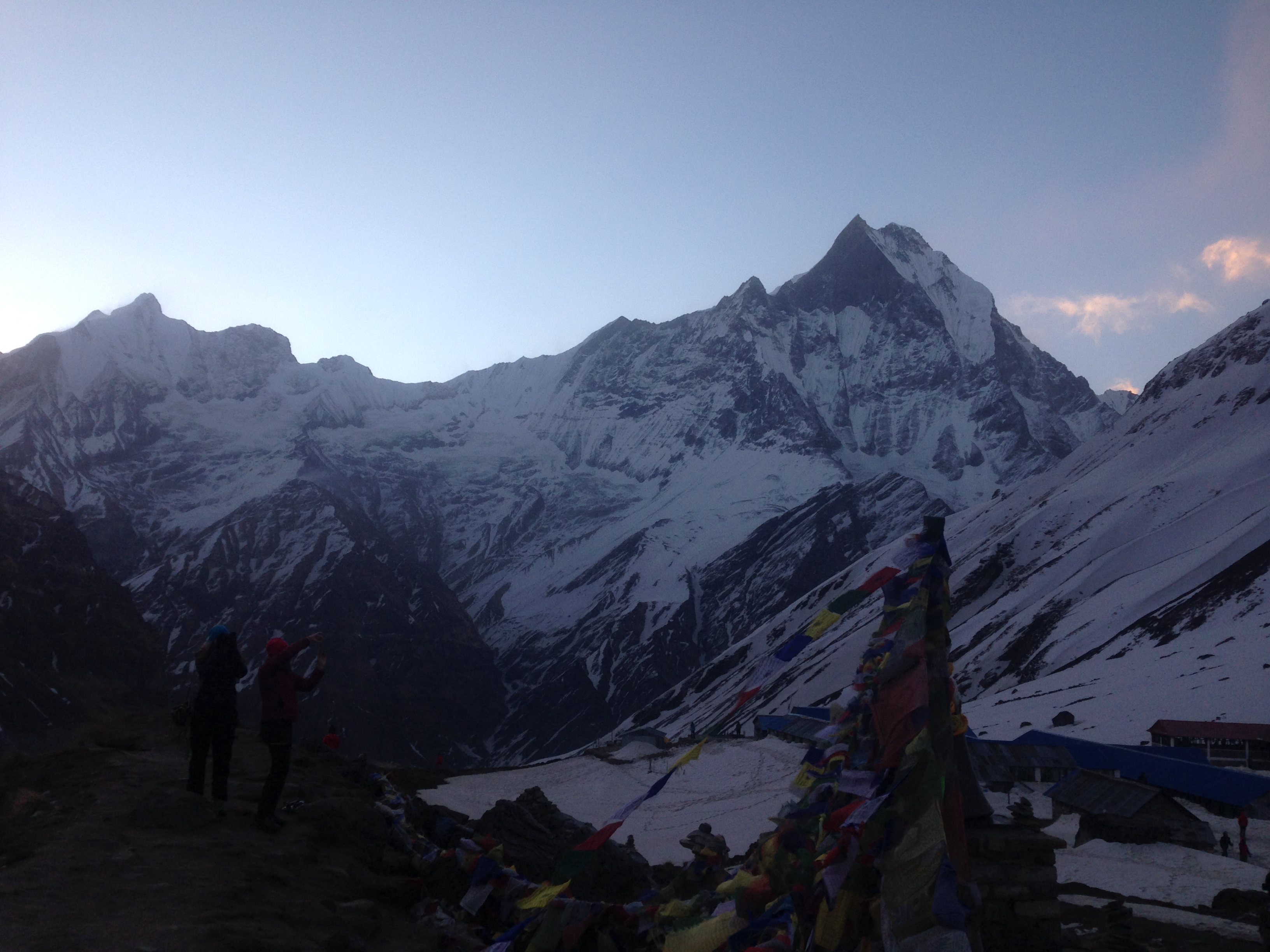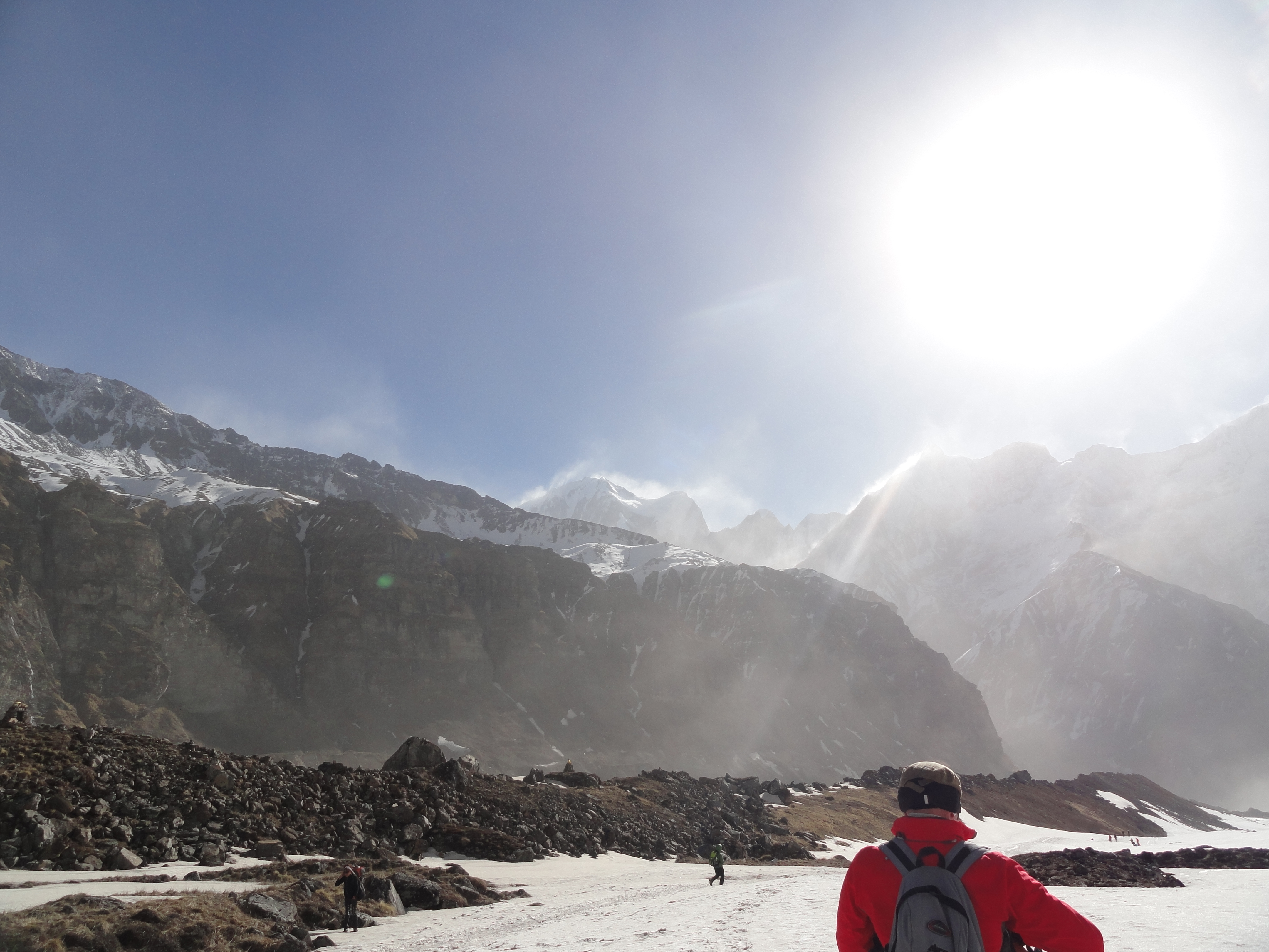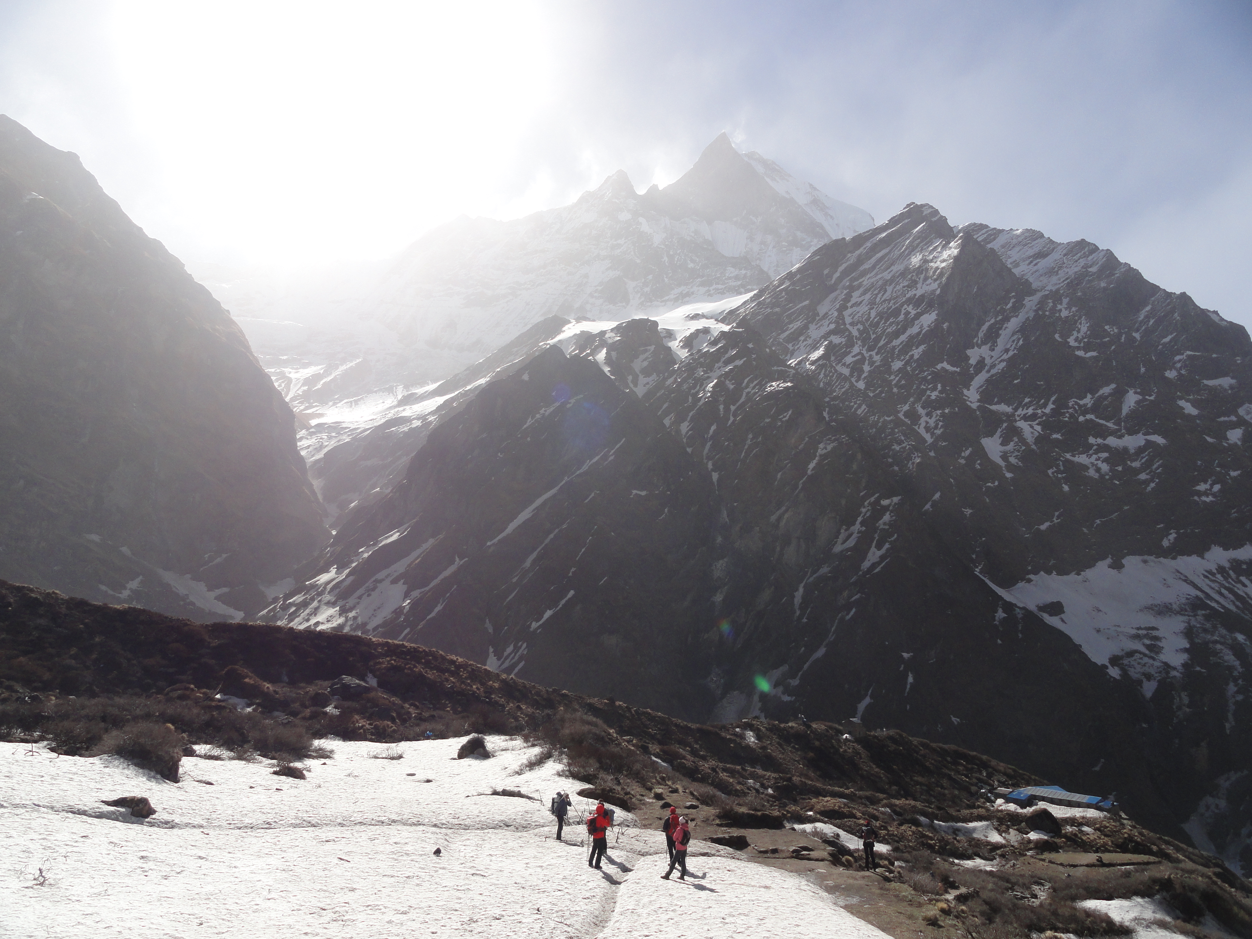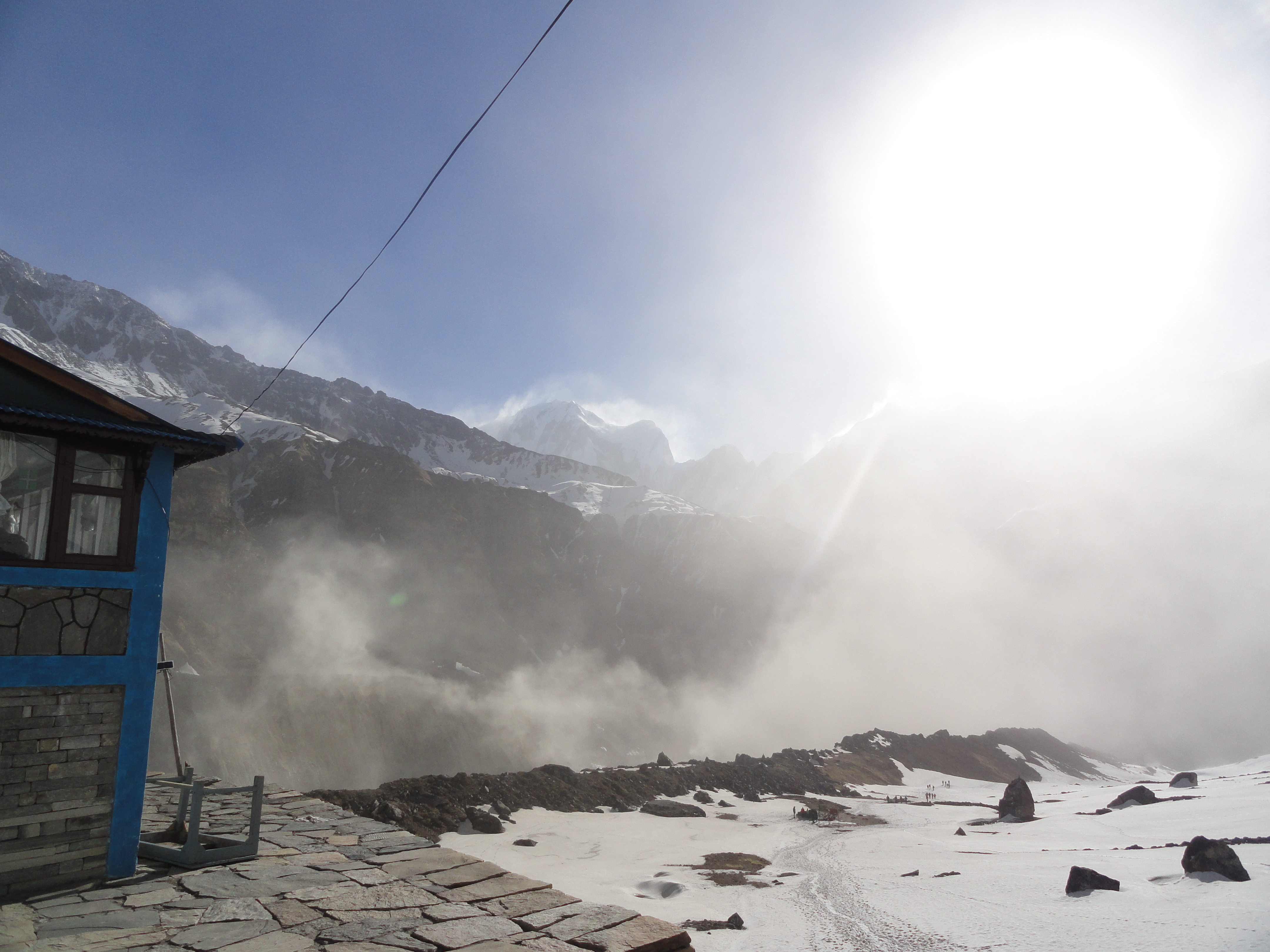 Let just say, when the morning came, the clattering metal roof tops in the wind didn’t help motivate me to get up. But thanks to Bart, we all made it up and out our cottage to see the sunrise from what is known as Annapurna Base Camp. And again, what a sight. Those mountains, the light, the moon, the sunbeams, the hostile environment… it makes you very conscious of how insignificant we humans really are. A combination of pure exquisite beauty with the realization that this is probably one of the most hostile places to be in. And that was made very apparent after breakfast when we headed down the mountain again. Here we got surprised by a massive wind and hail storm. Hail pellets the size of marbles pelting against us, bags flying, clothing flying… but luckily all safe. Thanks to Hebi and Min who knew how serious it was, and knew that we needed to get down and off that peak ASAP. A good long, slow walk got us back to Bamboo that day, where we managed to enjoy a relaxing afternoon.